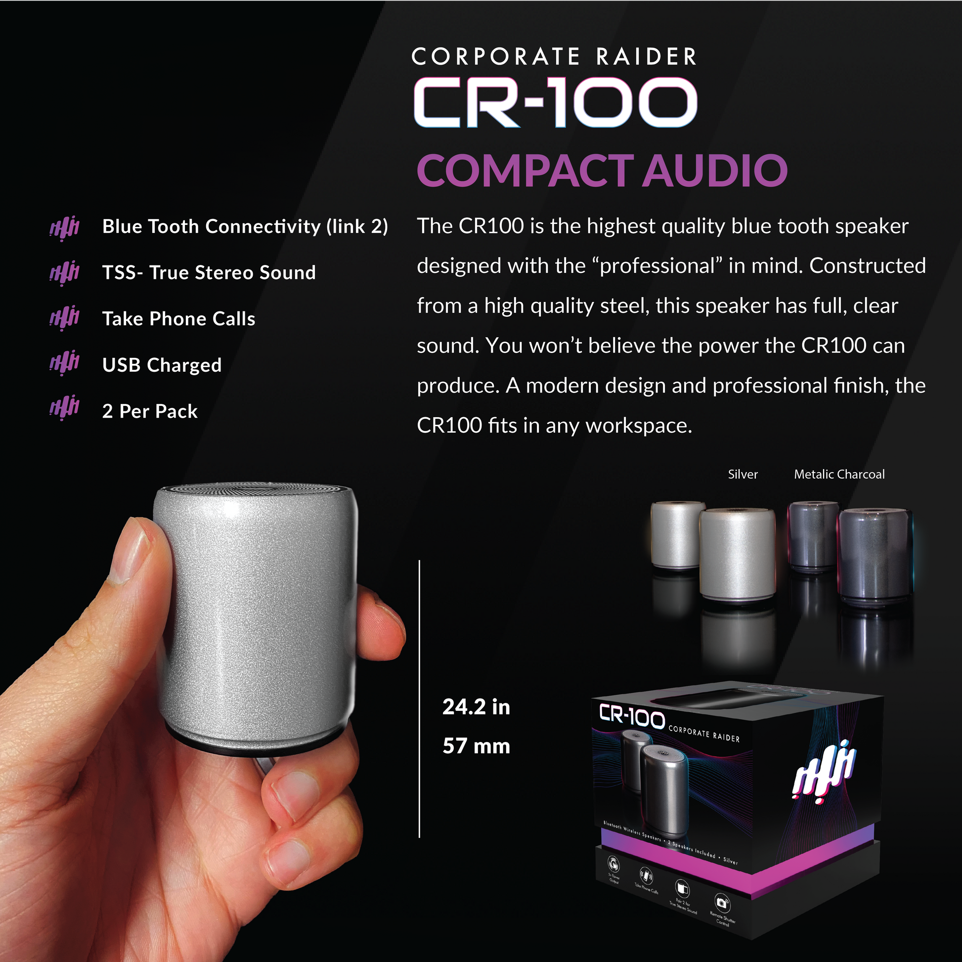 - EVERYTHING YOU NEED: The CR100 Bluetooth Speaker package includes two CR100 speakers, an extra high quality dual USB C charging cord and UL Listed Wall Charger
