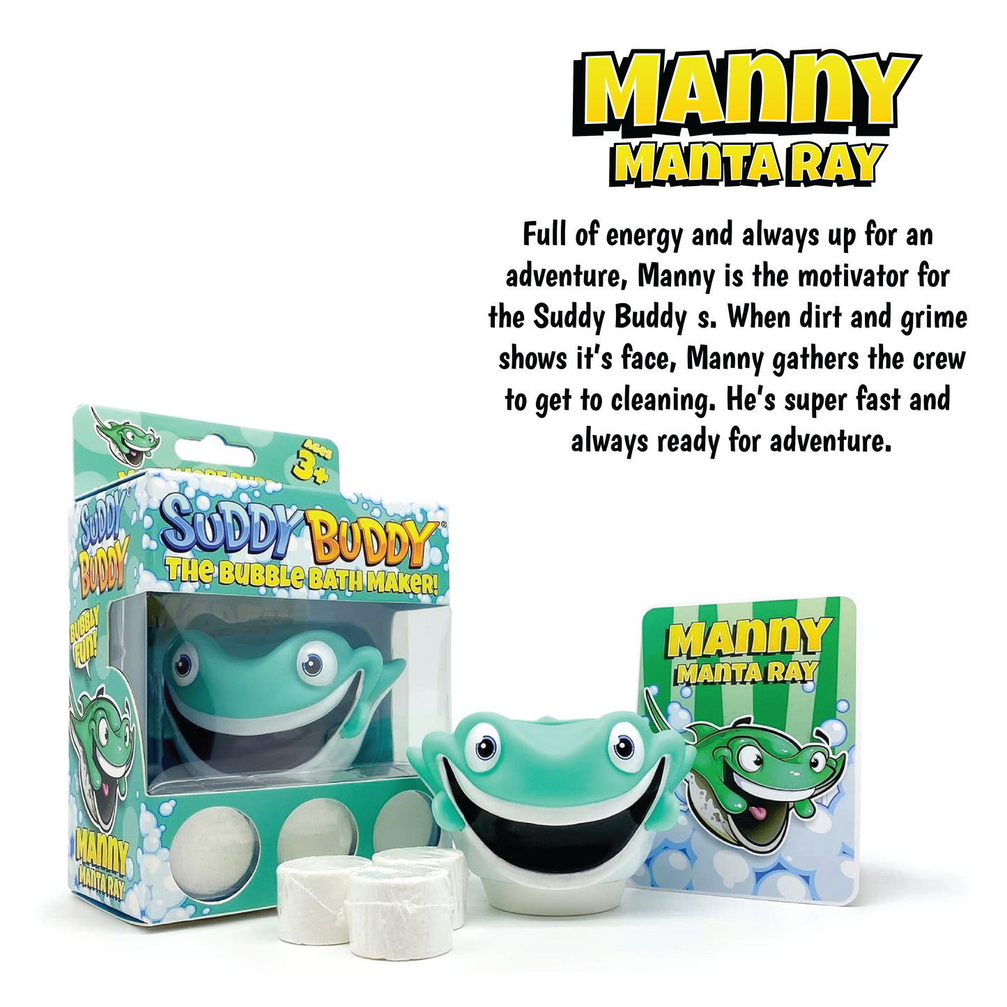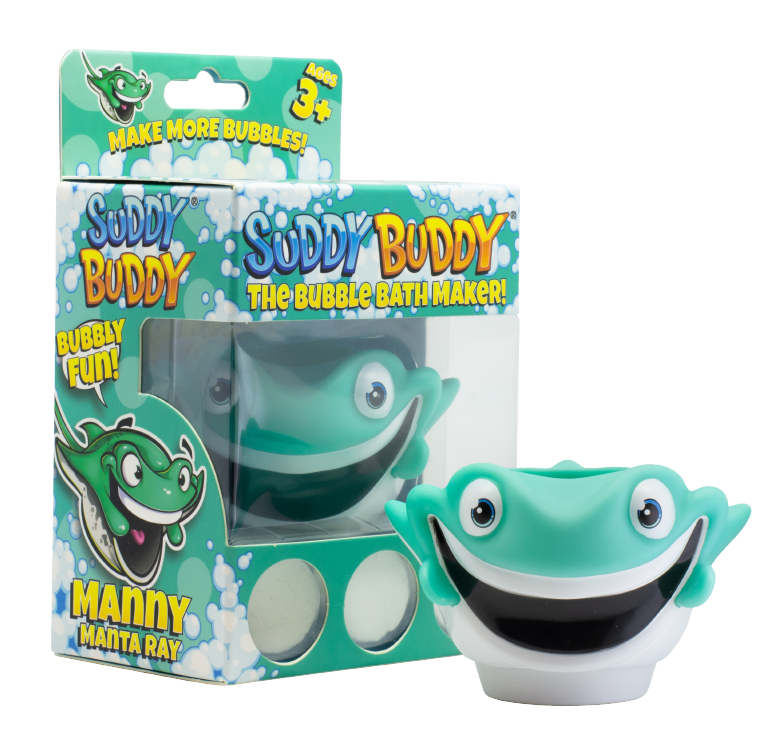 All Suddy Buddy® bath toy sets come with 1 Suddy Buddy® bath toy 3 Super Bubble Drops and a character trading card.